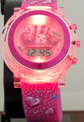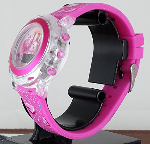 This watch is perfect for any child. It features a soft silicone band that will adjust to your child's wrist(6-8.5 inches) with 9 holes and a metal buckle clasp. Plus the band has a pinkish strawberry color with strawberry seeds on the entire band...really cute. The best feature of this watch is when you press the right corner button the entire face of the watch will start flashing colors for 15 seconds. You will be entertained to blue,red,yellow,green,whie,purple colors. Your child's friends will not be able to take their eyes off of this watch. The watch also comes in a shopkins gift box.Feature