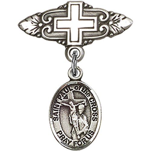 -. Title : Sterling Silver Baby Badge with St. Paul of the Cross Charm and Badge Pin with Cross 1 X 3/4 inches