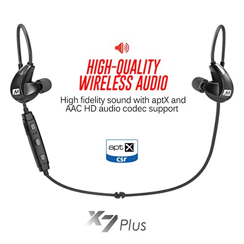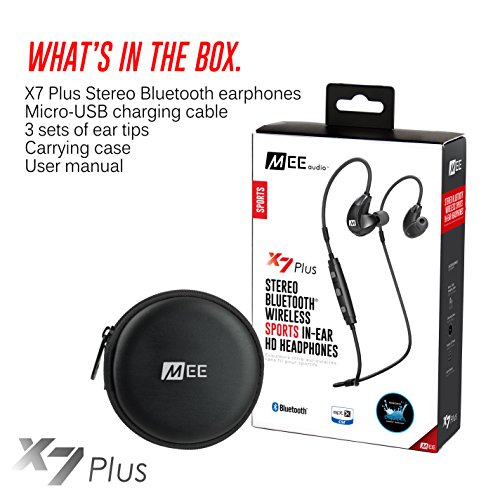 -. Binding : Electronics -. Brand : MEE audio -. Color : Black -. EAN : 0616312625437 -. Feature : High-quality wireless in-ear headset designed for active lifestyles / Over-the-ear fit with moldable "memory wire" is secure for any activity / Bluetooth 4.1 technology with Multipoint and support for aptX and AAC HD audio codecs / Sweat-proof design with Liquipel WatersafeTM Technology.Built-in microphone and controls; up to 8 hours of talk/music playback time; 1-year warranty / For information on troubleshooting, maintenance, and more please refer to the X7 Plus user manual below. -. Label : Mee Audio -. Manufacturer : Mee Audio -. Model : EP-X7Plus-BK-MEE -. MPN : EP-X7Plus-BK-MEE -. PackageQuantity : 1 -. PartNumber : EP-X7Plus-BK-MEE -. ProductGroup : Speakers -. ProductTypeName : HEADPHONES -. Publisher : Mee Audio -. ReleaseDate : 2016-03-15 -. Size : Wireless -. Studio : Mee Audio -. Title : MEE audio X7 Plus Stereo Bluetooth Wireless Sports In-Ear HD Headphones -. UPC : 616312625437