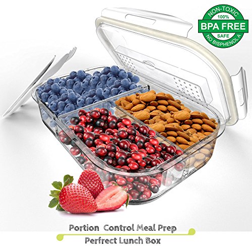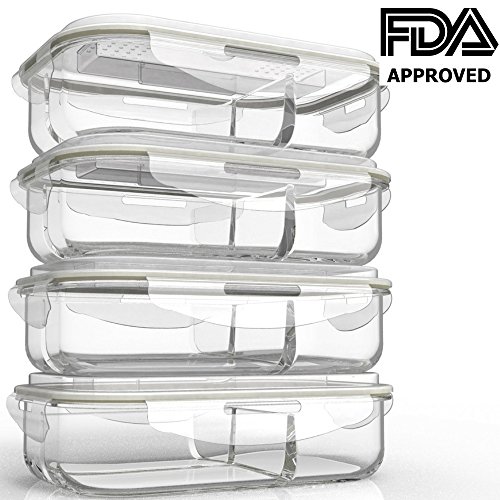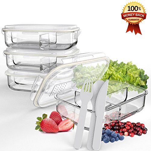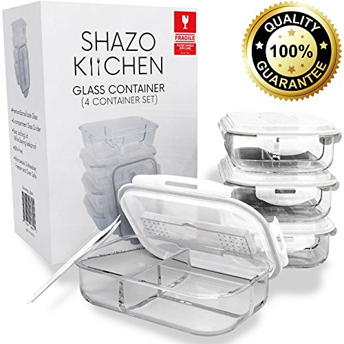 - [4 X 32oz] 3 COMPARTMENT GLASS CONTAINERS - Set Of 4 (32oz/Container) 3 Compartments Per Container To Allow For Precise Portion Control And Long-Term Storage. This Shazo Glass Food Storage Container Set Comes In A STACKABLE 4-Pack And Includes A HANDY CUTLERY COMPARTMENT (Utensils Included)