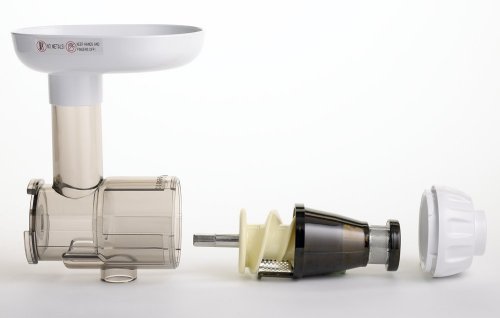 Includes: Juicing Screen Cone with the stainless steel mesh. It is used for all juicing functions and only juicing functions. Blank Cone Used for all functions except juicing. Constructed solid polycarbonate with a stainless steel rim on the inside. It is used for all functions except juicing. Oval Nozzle is used for mincing and chopping vegetables, making nut butters, homogenizing frozen fruit, milk or yogurt, extruding breadsticks Round Nozzle is used for mincing and chopping vegetables, making nut butters, homogenizing frozen fruit, milk or yogurt, extruding breadsticks Four Remaining Nozzles are used for extrusion of various sized pastas. Sieve fits on both of the bowls, may be used after processing items that seem to have too much pulp in the juice or foam on the top of the juice. It is best to use the sieve at the end of the juicing process by pouring all of the prepared juice through the sieve.