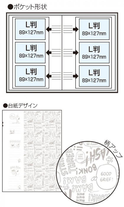 | 仕様 | ■印刷ポリプロピレン貼表紙 ■台紙:L判3段ポケットポイントシール台紙×30枚 ■写真収納枚数:L判180枚 ■無線綴製本 ■デザイン台紙 ■スリップケース入 |