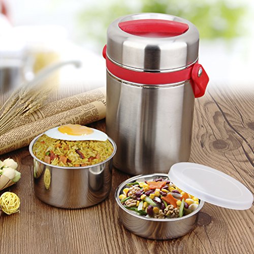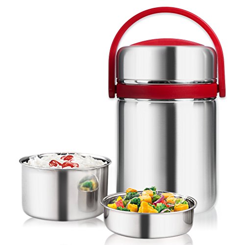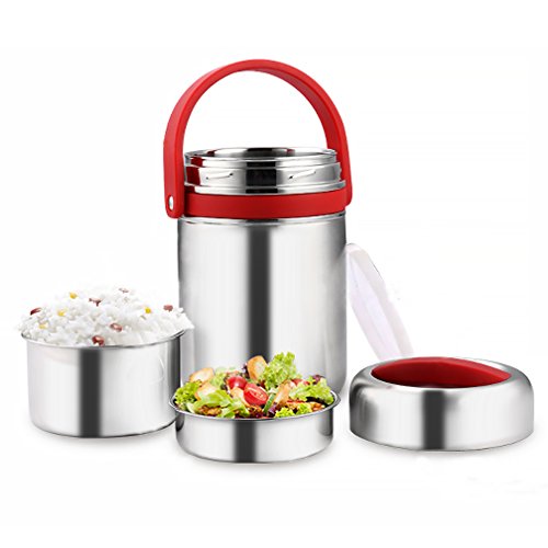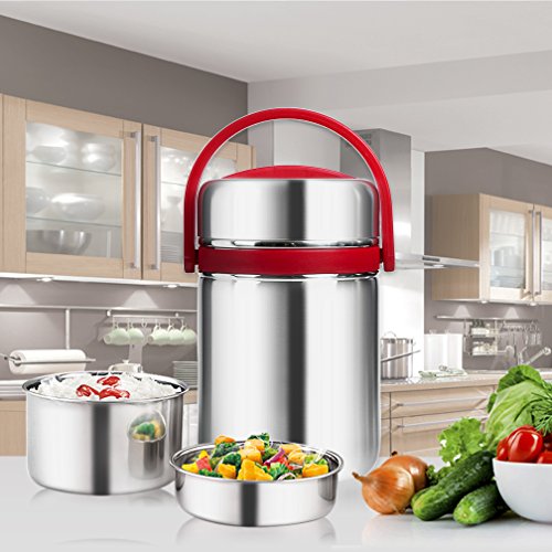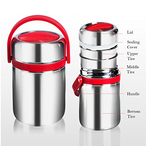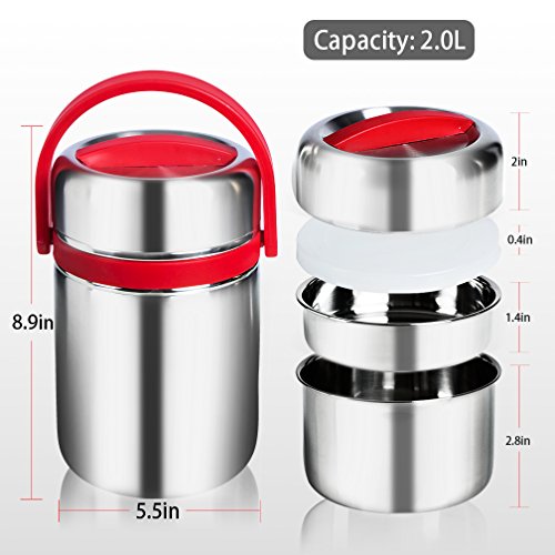 - UNIQUE DESIGN:Vacuum Insulated Lunch Container design in 3 Layers for you place staple food,and soup separately and smell will not mix,Leak Proof design with seal structure to prevent accidental spills or messes,Top Silicone ring enhance the sealing effect,2.0L Capacity is large enough to carry much food,Both suit for children and adults.