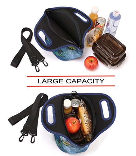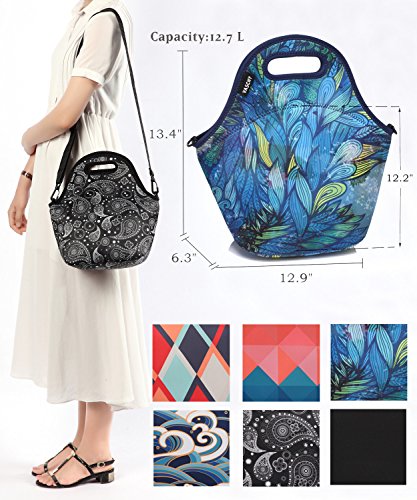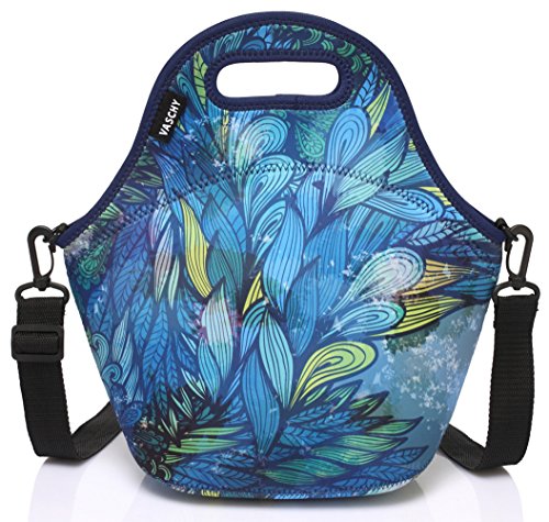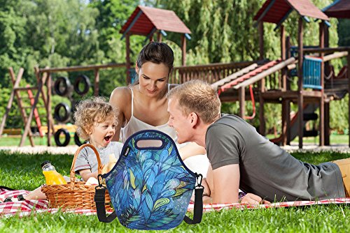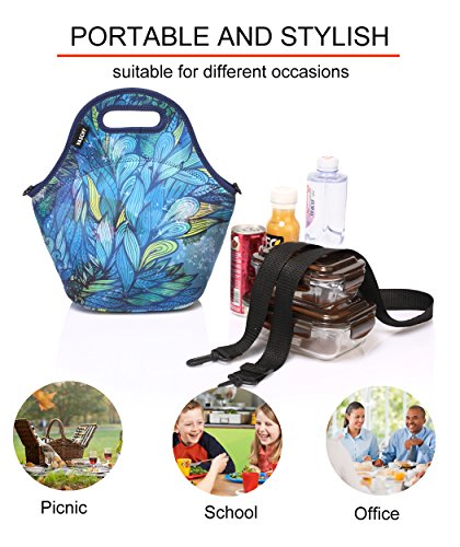 Vaschy Artist Designed Neoprene Insulated Lunch Bag Tote with Detachable Adjustable Shoulder Strap for Kids Women Hand-drawn Feathers