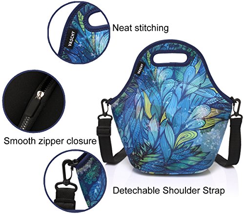 - 1.This Vaschy lunch tote bag is designed by a freelance artist, designer and illustrator. It is PVC and lead-free,safe for food. It is made of 4.5mm thick neoprene which will preserve your food’s cold or hot temperature for up to 4 hours.The lunch bag’s unique design allows you to keep ice packs in it, to keep your food fresh for longer.