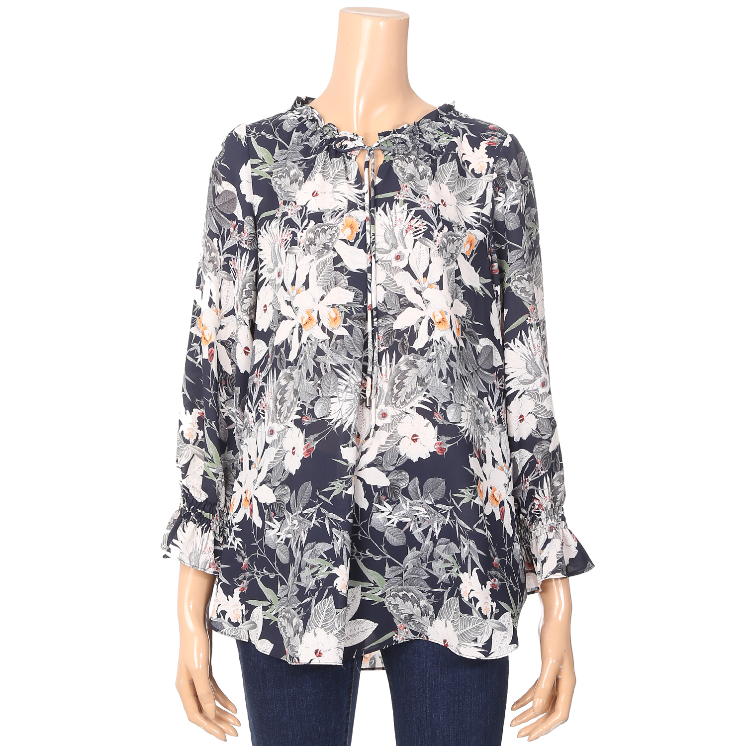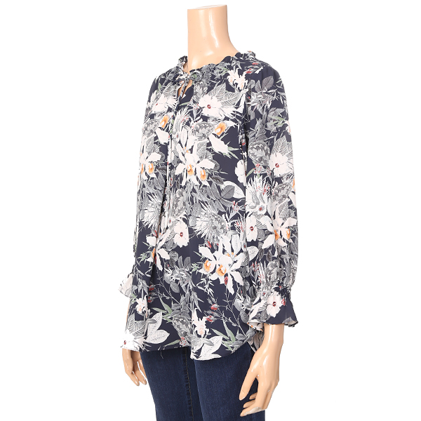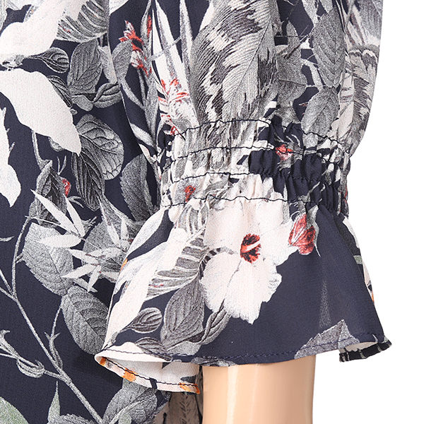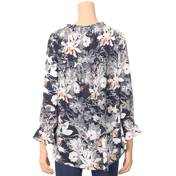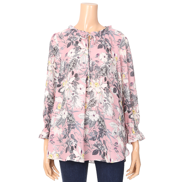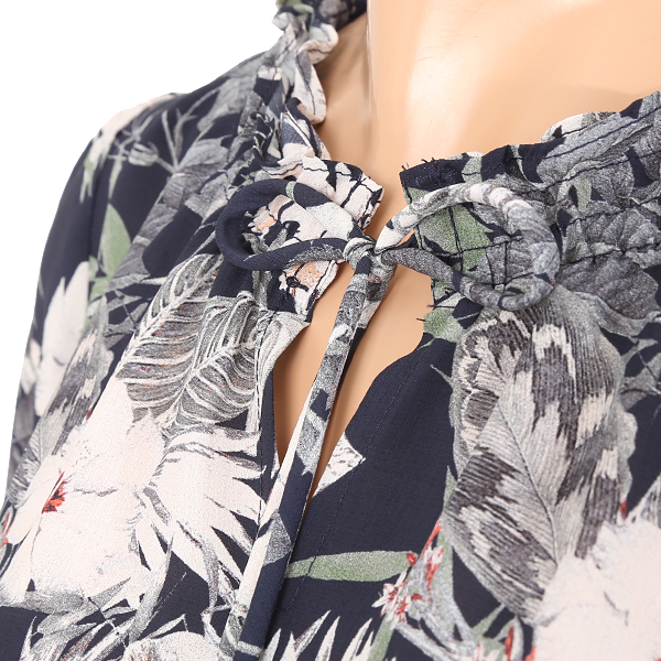 목선라인에따라 신축성있는 스트치로 처리함에 착용했을때 여성스러움을 돋보이게 할수있느 리본처리로 가능한 쉬폰 블라우스입니다 또한 소매끝부분도 신축성있는 처리 착용했을때 소매끝부분이 나팔형식으로 연출가능하며 전체적으로 꽃프린트로 구김이 없이 체형 상관없이 화사한 분위기을 연출착장이 가능한 아이템입니다