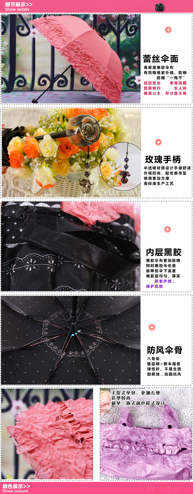 注:此款伞为五层蕾丝花边(共三层蕾丝+两层花边)。