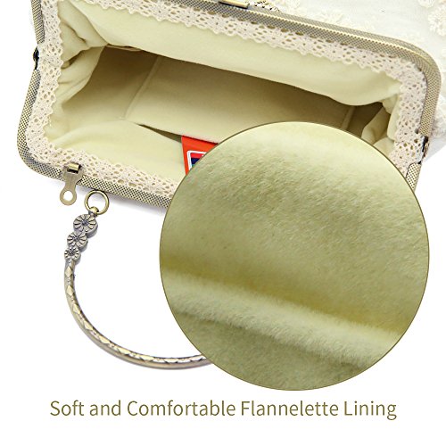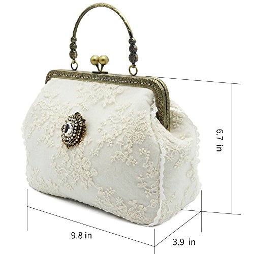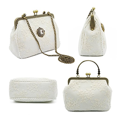 -. Feature : Miss Cat Versatile and Elegant Bag :This bag can be used as tote,shoulder bag,crossbody bag to satisfy your need and can match your dress,skirt.It is suitable for occasions like dating,party,gathering,shopping,traveling,wedding ceremony,where you will be eye catching with it. / Material:Cotton fabric;Fresh and elegant lace covered outside;Flannelette lining,you will feel soft and comfortable when you touch it. / Dimension:9.8in*3.9in*6.7in(L*W*H).Please allow few discrepancies.This bag is small but enough for you daily necessities like lip stick,make-ups,charger,cellphone and keys. / Outside Feature: Exquisite carving vintage top-handle and frame;Kiss lock closure;Removable rhinestone ornament.Simple decoration but add to the charm of this bag. Accessories:15.7 inches Vintage Short Metal Removable Chain(For Free),47.2inches vintage long metal removable chain(For Free) / Interior Feature:One main compartment,one open pocket and adjustable hangers which are for the chains and can be hidden when not using them.