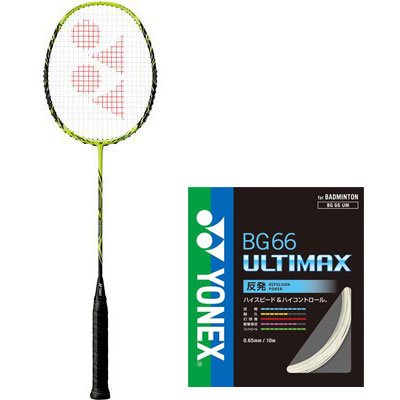 -. Feature : 【ラケット】 名称:ナノレイZ-スピード カラー:(500)ライムイエロー サイズ:3U(平均88g)4 フレーム全長:10mmロング / 素材: 高弾性カーボンフレーム+ソニックメタル+EX-HMG 高弾性カーボンシャフト+Xフラーレン+ナノメトリック 新内蔵T型ジョイント 付属品:フレーム(ソフトケース付)/C-SCS その他:日本バドミントン協会検定合格品 推奨張力:3U/20~27(lbs) / 【ストリング・ガット】 名称:BG66 アルティマックス カラー:(430)メタリックホワイト / 素材: (芯糸)高強度ナイロン:マルチフィラメント (側糸)ハイポリマーナイロン:ブレーディング加工 太さ:0.65mm 長さ:10m その他:日本バドミントン協会検定合格品