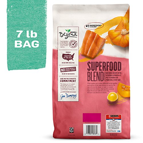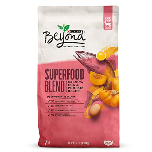 Serve your dog Purina Beyond Superfood Blend Salmon, Egg & Pumpkin Recipe Natural adult dry dog food, and give him a meal created with nutrient-dense ingredients. Real salmon is the #1 ingredient in this dry dog food, and other high-quality ingredients, including pumpkin and whole oatmeal, round out this recipe for wholesome goodness. Natural ingredients plus essential vitamins and minerals provide your adult dog with the complete and balanced nutrition he needs to support his long-term health. We craft this premium dog food without artificial colors, flavors or preservatives, and it's made with real, recognizable ingredients you can trust. For added peace of mind, this recipe contains no ingredients from China. Make this Purina Beyond Superfood Blend dry dog food recipe part of your dog's regular feeding routine, and give him a natural dog food that meets all your ingredient criteria. Satisfy your best friend's cravings with the tasty crunch of this Purina Beyond dry dog food.Feature