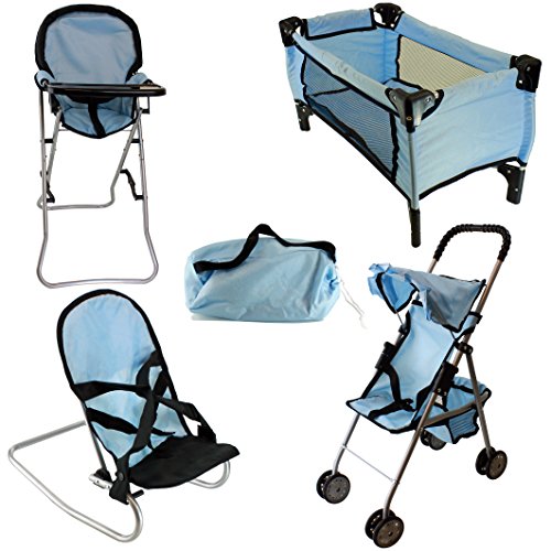 -. Binding : Toy -. Brand : Mommy & Me Doll Collection -. EAN : 6906131800141 -. Feature : DOLL CARRIAGE/ PACK N PLAY/ HIGH CHAIR/ BOUNCER. All pieces are separate & nothing to transfer / All 4 Items are fully assembled. Easy to fold and go Will fit any doll up to 18 inches. / Carriage high chair & bouncer have seat belts, Pack N play comes with a blanket & beg / Color is HOT BLUE and suitable for Boys or Girls. / Made of top quality & Safety tested for lead free -. IsAdultProduct : 0 -. Label : Mommy & Me Doll Collection -. Manufacturer : Mommy & Me Doll Collection -. MPN : 0141 -. PackageQuantity : 1 -. PartNumber : 0141 -. ProductGroup : Toy -. ProductTypeName : TOYS_AND_GAMES -. Publisher : Mommy & Me Doll Collection -. Studio : Mommy & Me Doll Collection -. Title : Mommy & Me 4 in 1 Doll Play Set Fits 18'' Dolls. (HOT BLUE)