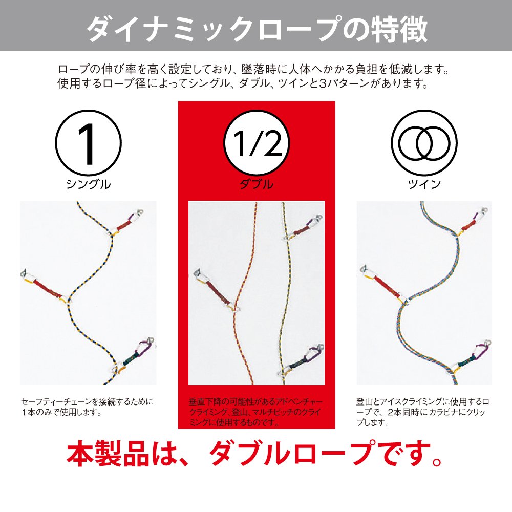 ★ Double rope: It is used for climbing adventure climbing, possibility of vertical descent, climbing, multi-pitch climbing.