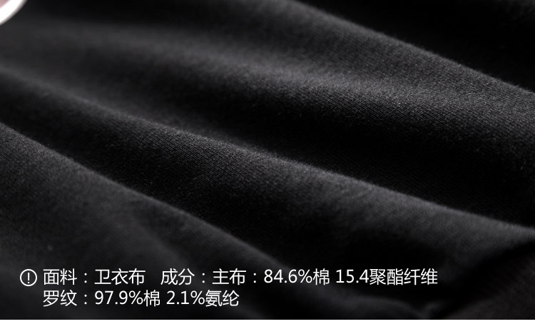 | 面 料:84.6%棉 15.4聚酯纤维 罗纹:97.9%棉 2.1%氨纶颜 色:焦糖,黑色 |