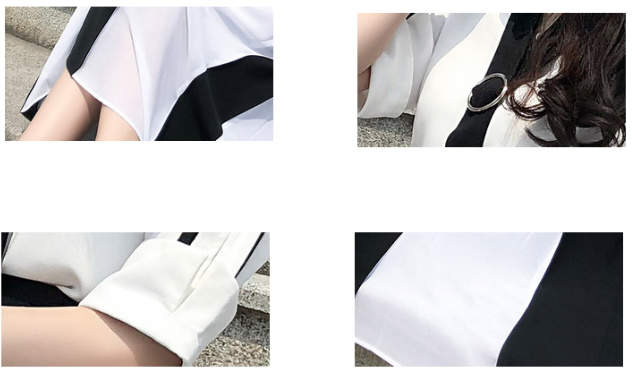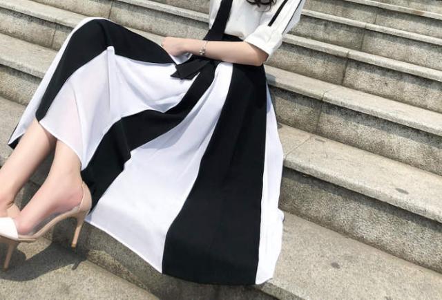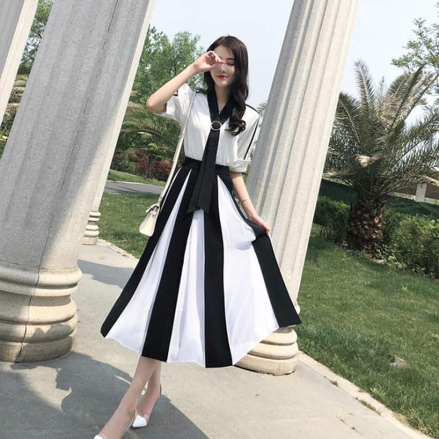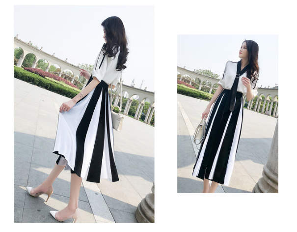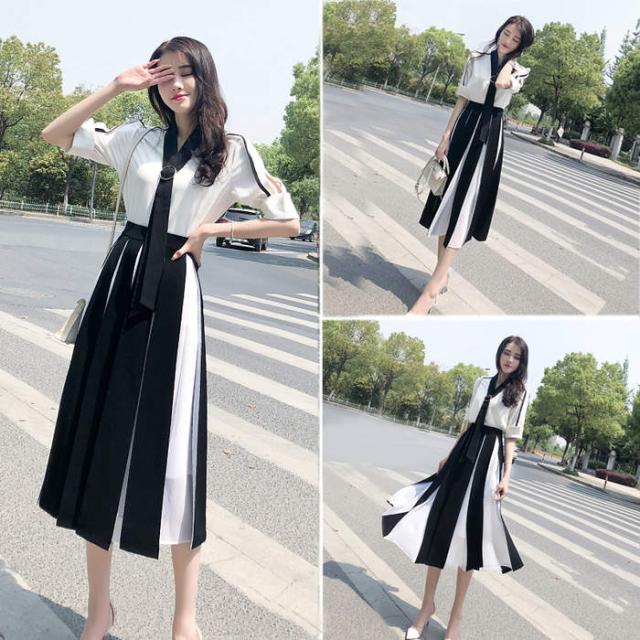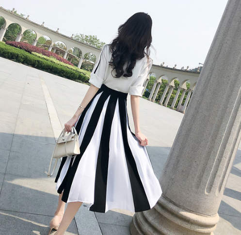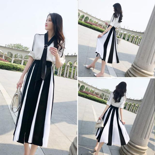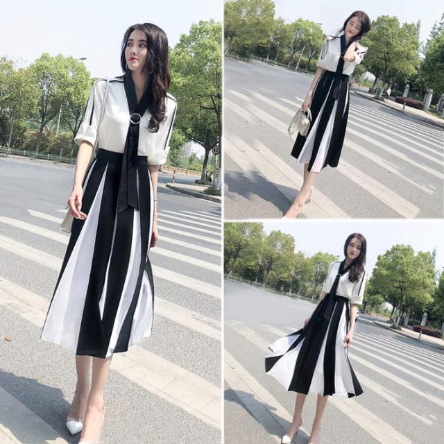 女性の服 Vネック 半袖 シフォン 黒と白 トップ スカート ツーピーススーツ