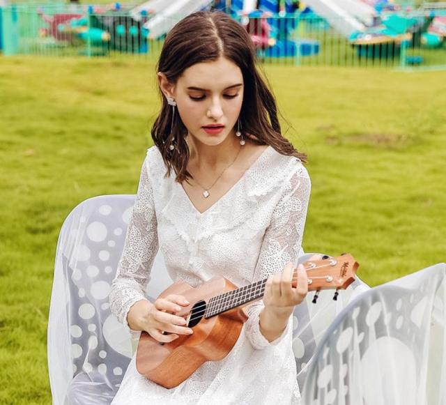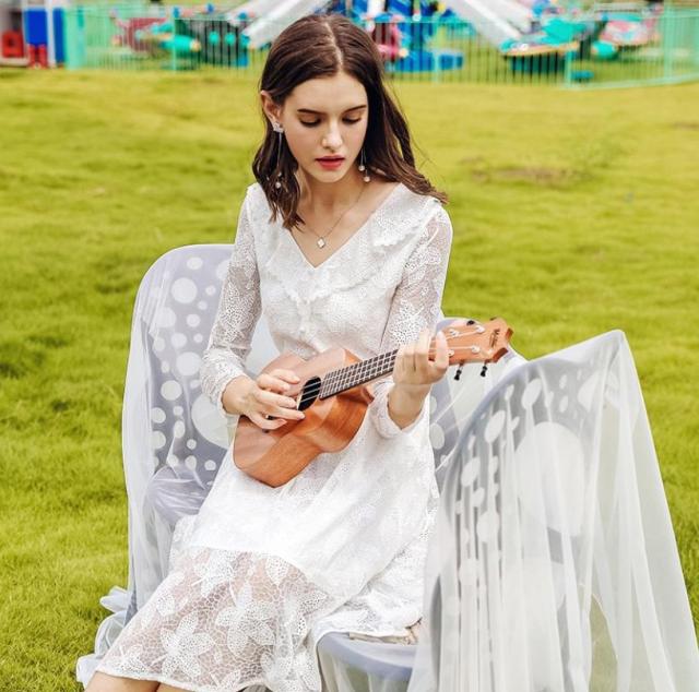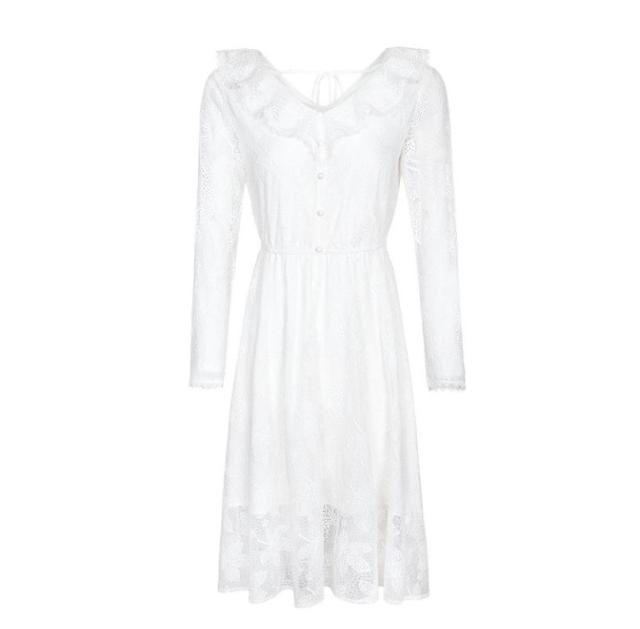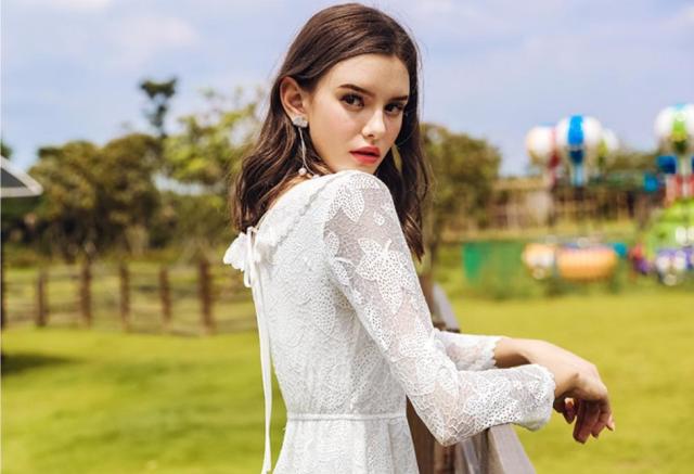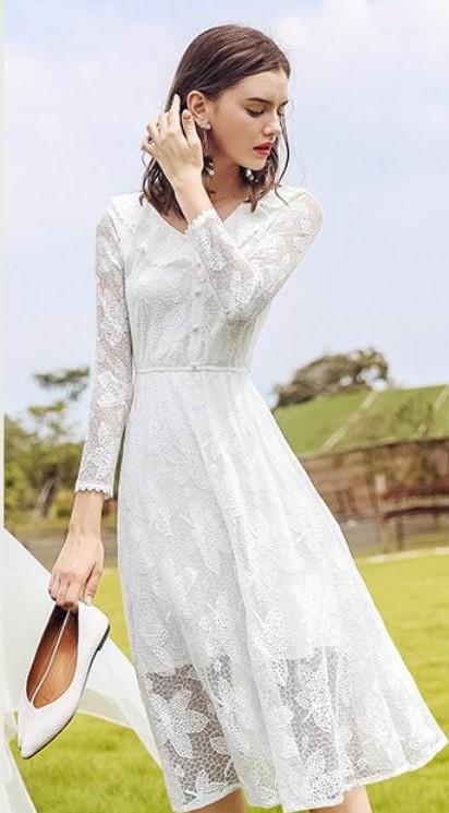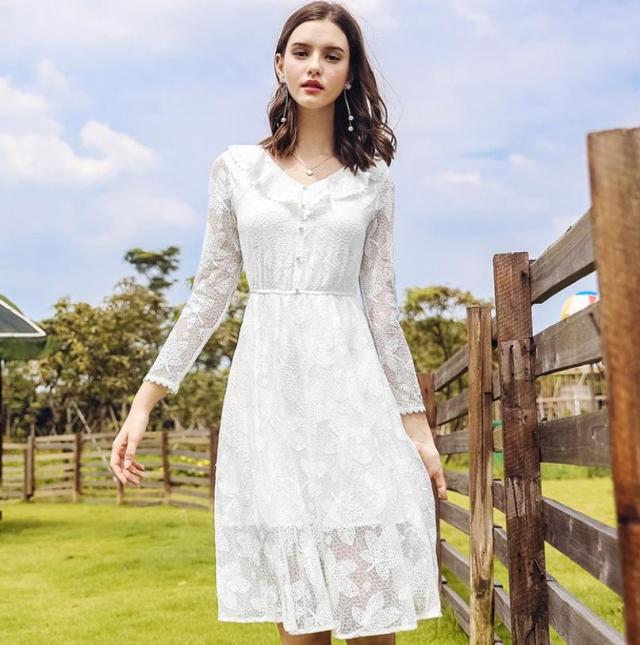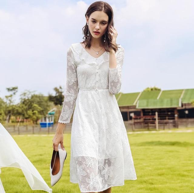 ・キーワード:V字襟 Aライン 長袖 レース キレイ ミディアム丈 2018年秋トレンド ドレス ワンピース