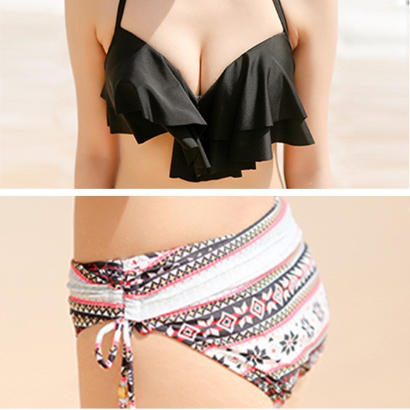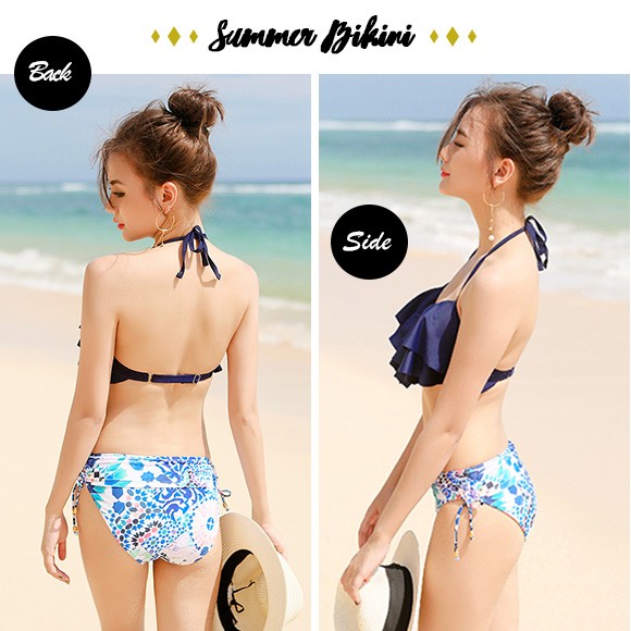 2点セットのレディース用ビキニです☆★落ち着いたシックなカラーのブラと、個性的な柄の組み合わせが大人可愛い♪胸元は3段フリルになっているから、ボリュームUPして見えちゃうスグレモノ!!可愛いだけじゃ物足りない!そんな大人女子におすすめです☆【商品詳細】カラー:ブラック/ネイビー/カーキM ブラアンダー:約56-68cm ショーツウエスト:約62-72cm カップサイズ(目安):A・B・C・DL ブラアンダー:約60-72-cm ショーツウエスト:約66-76cm カップサイズ(目安):C・D・EXL ブラアンダー:約64-76cm ショーツウエスト:約70-80cm カップサイズ(目安):D・E・F素材:本体:ナイロン82% ポリウレタン18%裏地:ナイロン100%※ブラとショーツの2点セットです。ワイヤー入り・ブラパッドは取り外し可能ストラップの取り外しはできません。ブラのアンダーはサイズ調節可能。