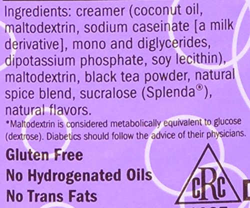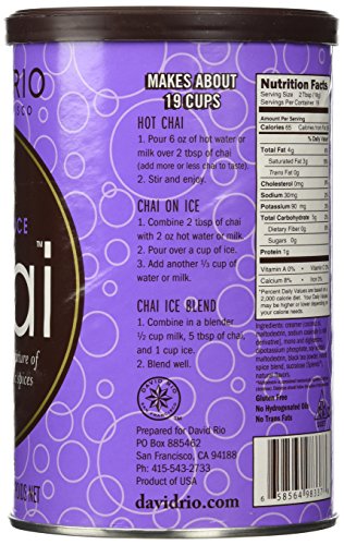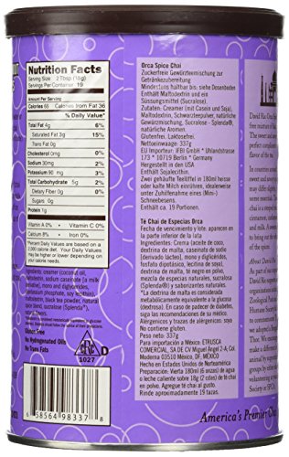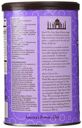 -. Binding : Misc. -. Brand : David Rio -. EAN : 0658564983378 -. Feature : David Rio's traditional spiced chai with Splenda / Low calorie & low carbohydrate / Simply mix with hot water or milk / 1 canister makes about 16 cups -. Label : David Rio -. Manufacturer : David Rio -. PackageQuantity : 2 -. ProductGroup : Grocery -. ProductTypeName : GROCERY -. Publisher : David Rio -. Size : 11.9 Ounces -. Studio : David Rio -. Title : 2 canisters of Orca Spice Sugar-Free Chai, 11.9oz. -. UPC : 658564983378