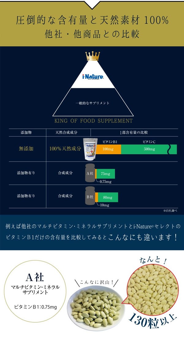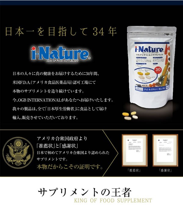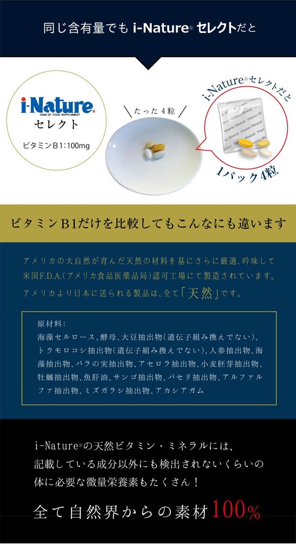 | <h1>サプリメント大国・アメリカ生まれの総合ビタミン&ミネラルサプリ!飽食の時代、豊かな食の時代といわれる今、私たちは十分なビタミン、ミネラルが摂れているでしょうか。アイネイチャー・セレクトは、体の健康維持に必要な15種類のビタミンと12種類のミネラルを高濃度で配合。1回分ずつパックされているので持ち歩きにも便利!</h1> |
