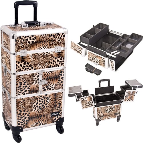 Sunrise I3264LPBR Leopard 3 Tiers Accordion Trays 4 wheels Professional Rolling Aluminum Cosmetic Makeup Craft Storage Organizer Case and Easy Slide Trays and Extendable Trays with Dividers