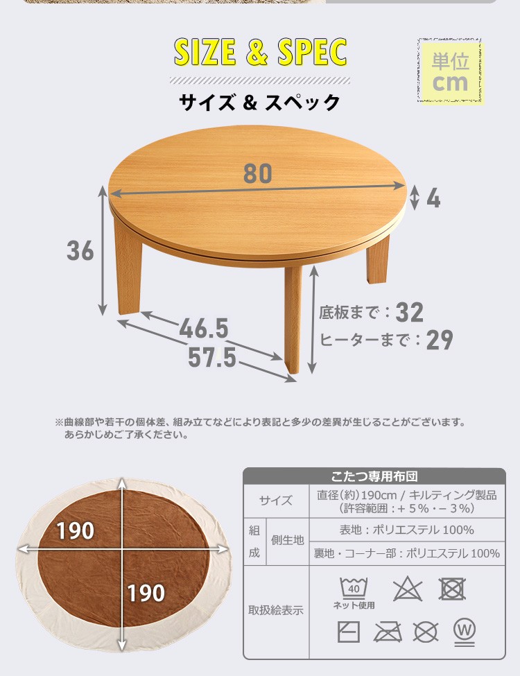 こたつ本体サイズ:直径80x36cm こたつ布団:直径190m(許容範囲+5%・-3%)【商品重量】15.8KG
