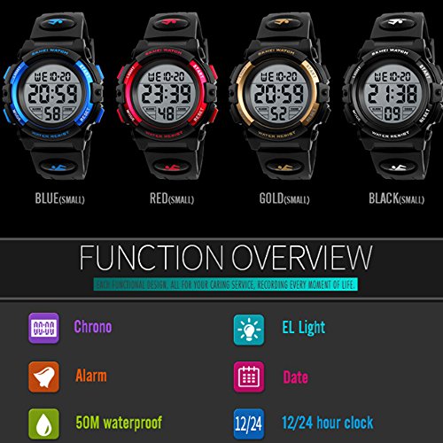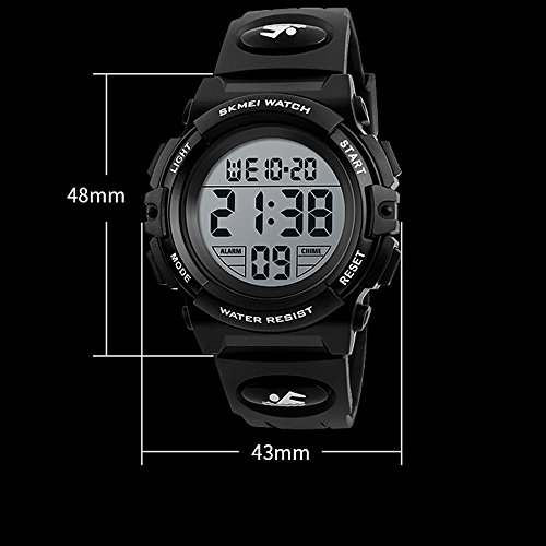 -. Feature : Multifunction Kids Digital Watch: Back Light,Alarm,Water Resistant,Week Display,Chronograph,Shock Resistant,Stop Watch,Complete Calendar,Auto Date,LED display, These Functions Make This Boys Digital Watch Suitable For Indoor And Outdoor Sports Use / Water Resistant Digital Watch For Boys: 5 Atm ( 164 Ft / 50m Waterproof ), Swimming, Surfing, Shower, Hands Washing, Raining All No Problem! Note: Please Do Not Press Any Buttons Underwater. / High Quality Material Boys Watch: Original Japanese Digital Movement, Provide Precise And Accurate Time Keeping. Bright Backlight Help You To Check The Time Anytime. Hardness Resin Glass Protect You From Daily Light Scratch. / Easy To Set Up: It Is Able To Operate The Digital Watch By Children Own. Nice Watch For Elementary Age Kids. Kids Watch Designed For Boys And Girls 5-12 Years Old, Fashion Gifts For The Kids You Love. / Pakcage:original box*1,watch*1,use manual*1;Comfortable Sports Watch For Kids: Soft Black PU Strap And Durable Plastic Case, Stainless Steel Case Back Bring Comfortable Wearing Experience.