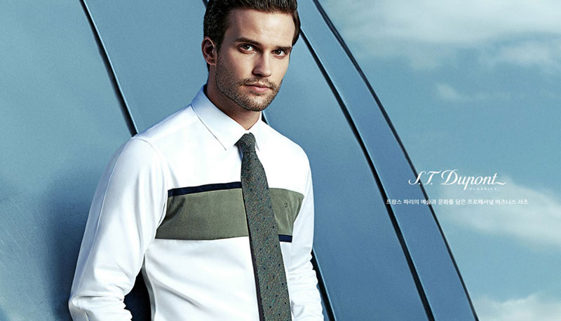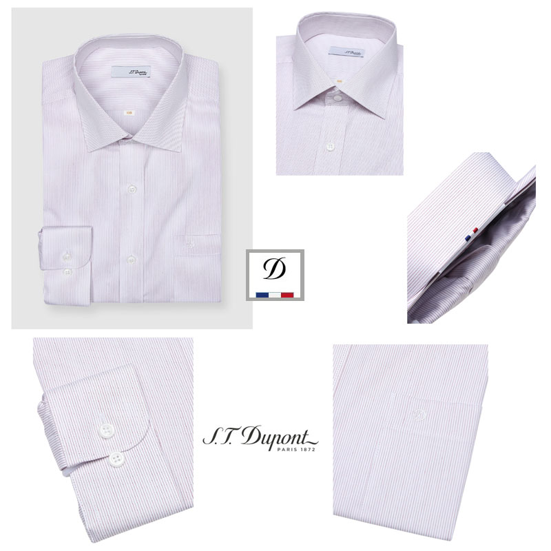 클래식한 핀스트라이프 원단의 카라뒷고대 삼색자수가 포인트인 비지니스 제품의 긴소매 비즈니스 라인 셔츠 입니다.