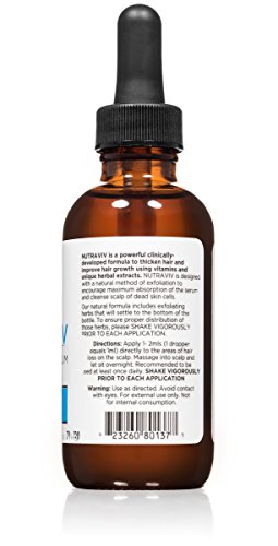 NUTRAVIV is a powerful clinically developed formula to thicken hair and improve hair growth using vitamins and unique herbal extracts. NUTRAVIV is designed with a natural method of exfoliation to encourage maximum absorption of the serum and cleanse scalp of dead skin cells. Our natural formula includes exfoliating herbs that will settle to the bottom of the bottle. To ensure proper distribution of those herbs, please SHAKE VIGOROUSLY PRIOR TO EACH APPLICATION.