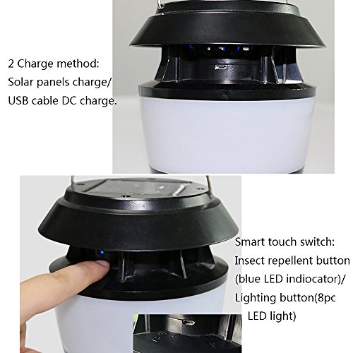 With high quality solar panel and PC lampshade,long life and good performance.2 function switches:touch switch:left touch switch controls the mosquito repellent function.the right one controls the light's on and off.