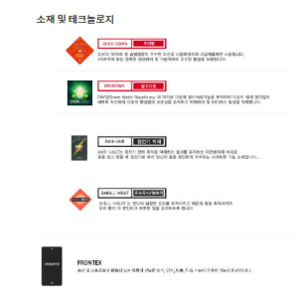 원단뿐 아니라 내장된 다운 자체에 최첨단나노 필 파워 기술을 적용한 DWR DOWN,눈과 비 같은 외부 습기의 침입은 막아주고,내부의 땀은 배출함으로써 다운이 젖거나 뭉치는 것을 막아주기 때문에 보온성과 내구성이 한층 더 돋보이는 제품.