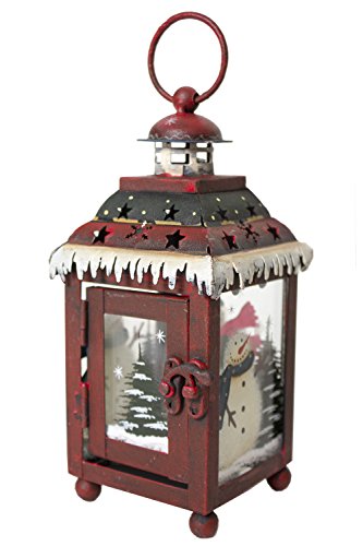 -. Feature : Measures: 6½" high by 3¼" wide / Tiny snowflake and star cutouts / Painted windows with wintry pine trees and snowman scenes / Latch hook and small ring for carrying or hanging / Made of painted metal and glass with distressed, vintage design