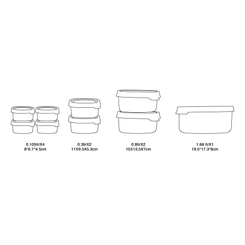 - Set includes: 4 (0.1L size: 3.1“ x 2.6“ x 1.8“). 2 (0.3L size: 4.3“ x 3.7“ x 2.1“). 2(0.8L size: 5.9 “ x 5.3“x 2.8“) 1 (1.66L size: 7.7“ x 6.8“ x 3.1“).