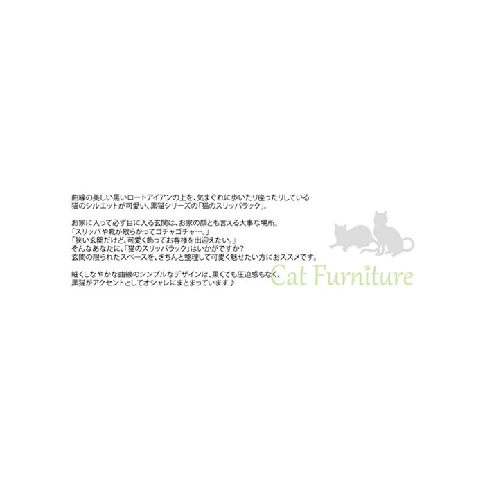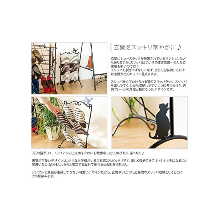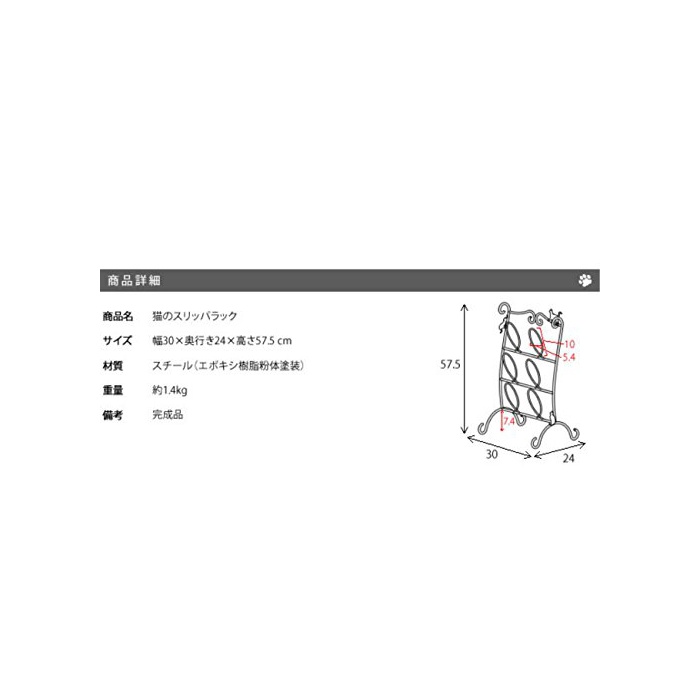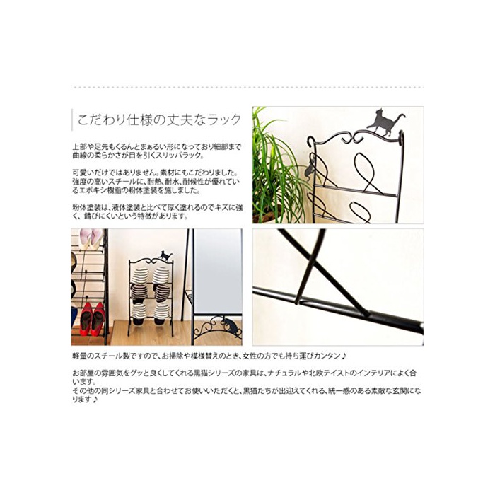곡선이 아름다운 검은 로트 아이언 위를,일시적인 기분으로 걷거나 앉거나 하고 있는 고양이의 실루엣이 귀여운 집 에 들어 가 반드시 눈(째)에 들어 오는 현관은,집의 얼굴이라고도 말할 수 있는 소중한 장소.「슬리퍼나 구두가 흩어져《고차고차》….」「좁은 현관 이지만,귀엽게 장식해 고객을 마중나가 대.」그런 당신에게,「고양이의 슬리퍼 lak」네인지(든가)입니까?현관이 제한된 스페이스를,정확히 정리해 귀엽게 매료 시키고 싶은 분(쪽,편)에 권장입니다.※상품 이미지의 소품등은 상품에 포함되고 있지 않습니다.비고:완성품 사이즈 용량 제품 사이즈:폭30×(길이)깊이24×높이57.5cm포장 사이즈:59×27×33cm규격■소재 성분:스틸(분체 도장)■팩키지:개별상