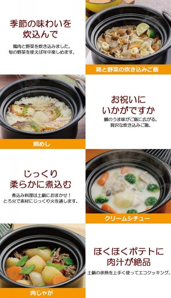 | 内蓋と外蓋の二重蓋仕様となります。炊飯土鍋は熱のあたりがやわらかく蓄熱性が高いので、お米を包むように熱を伝えます。遠赤外線効果に加え二重蓋による圧力効果で、美味しいご飯がたきあがります。火を止める時間を少し伸ばせば、香ばしい匂いと共におこげも楽しめます。直火・オーブン・電子レンジ使用可能です。料理の加熱等に電子レンジをご使用頂けますが、電子レンジでの炊飯はできませんのでご注意ください。 |