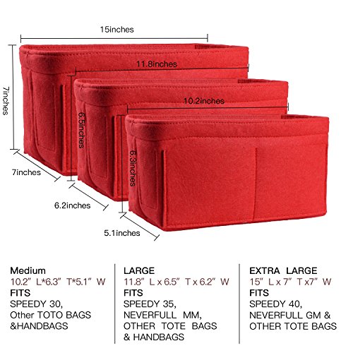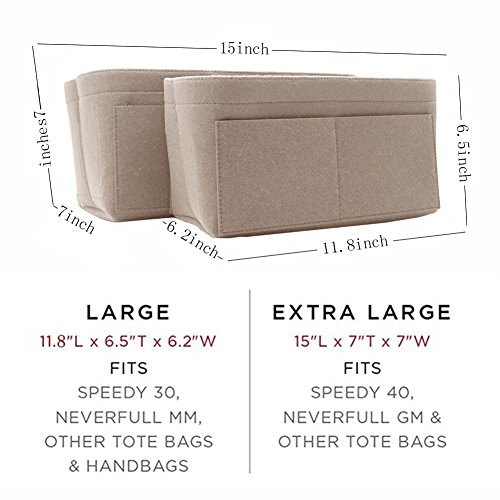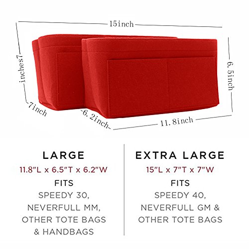Product DescriptionMaterial: Felt Fabric with high-quality Two Size: wo Size: Large: 11.8*6.5*6.2inch. Extra Large: 15*7*7inch Design: 13 Pockets Organizer Purse, 3 exterior pockets, 10 interior mesh pockets Color: Beige, Red, Black, Grey, Four Colors for choose0