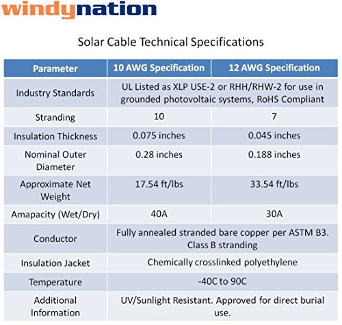 SEE IMAGE #2 in the photo gallery for 10 AWG and 12 AWG solar cable specifications