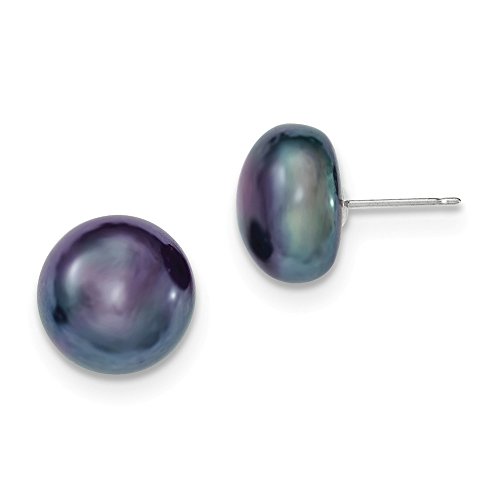 Solid 14k White Gold 11-12mm Black Button FW Cultured Pearl Stud Earrings