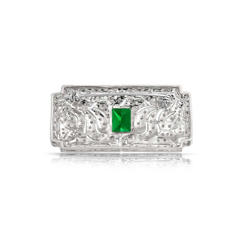 Green and glorious. Add this remarkable piece of Art Deco Style jewelry to your collection. In the style made famous in the 1920s, the Art Deco Style period is known for linear symmetry and for having an elegant and ornamental style. Our Simulated Emerald cu flower brooch pin is a prime example of a piece of jewelry designed in this era. It is very versatile and will make a wonderful gift for women of all ages, especially for someone who celebrates an April or a May birthday. In the center of the piece, an extraordinary, deep green Simulated Emerald colored, Emerald Cut stone that measures 12mm by 10mm is set against a background of pave leaves and flowers. The design is timeless and elegant. Order one today for yourself or for a special person in your life to help celebrate a special occasion.Feature