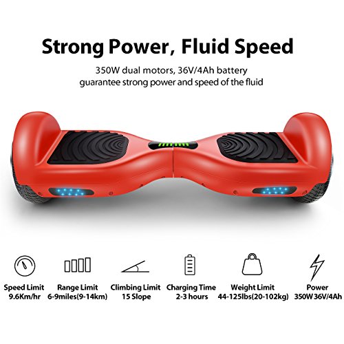-. Feature : UL SAFETY:UL 2272 Certified self-balancing scooter pass all UL safety test and bring you a peace of mind on voervoltage,temperature increases,overcharging of battery,overcurrent and short circuit protection;Scratch-resistant and fire retardant shell casing with matte finish also for your utmost safety.The UL sticker and warning label will be on the bottom of each VEEKO hoverboard product. / FEATURES: Two 6.5'' aluminum rubber tire wheels with 350W dual motor/700W in total,built-in lithium-ion battery pack (20pcs 36V/4Ah cells) which guarantee speed and long playing time (around 4-6 hours); Max around 44-225 lbs of weight,top speed of about 9.6 mph,and generally have a range of about 6-9 miles; Two groups LED lights as signals when you start/stop or turning,two LED dicators help to monitor battery volume and board health status;Non-slip foot pedals for more comfortable riding / ADVANTAGE: Professional gyroscope and acceleration sensor ,servo-control system ensure the balance and offer you the smoothest ride on hoverboard; Strong power motors and top quality battery pack make sure stable riding performance and bring you a good experience.You can travel freely around the city without being bound to the schedule of trains and metrors, or just for leisure fun. / WARRANTY: Each VEEKO Hoverboard with a 1-Year manufacturer warranty against mechanical defects. If you receive a defective item, any technical support or customer service support needed for return or replacement, please contact us by calling US local customers service number 562-941-0007, or by email at may@baiyutrade.com / NOTE:Please make sure your have bought from GAZE SECURITY that is the only authorized seller for this hoverboard.The warranty is only offered to the original purchaser of the product from GAZE SECURITY, please consult may@baiyutrade.com for any support.