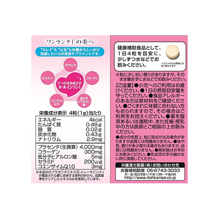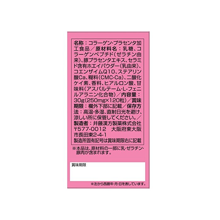 원재료 : 유당,콜라겐 펩티드(젤라틴 유래)고, 돈프라센타(태반) 엑기스,히알론산,세라미드 함유《호에이파우다》(유유래)고, 코엔자임Q10,《쇼》당 지방산 에스테르,풀료(CMC-Ca)고, 2산화 규소
