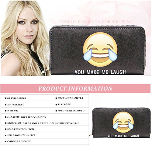 -. Binding : Apparel -. Brand : Badiya -. Department : womens -. Feature : Material: PU leather / Product Dimensions: 7.5 x 0.8 x 3.5 inches / Capacity - 8 credit card slots, 1 zipper coin pocket, 2 full length compartment in the middle (one for your cell phone and the other for your cash). / Exquisite zipper design - beautiful and durable golden metal zipper helps you open and close purse quickly, bringing your life convenience. / Unique Pattern Style - Many Kinds Interesting pattern style, makes your wallet looks full of mystery and unique. -. Model : WW04640 -. PackageQuantity : 1 -. ProductGroup : Apparel -. ProductTypeName : ACCESSORY -. Size : One Size -. Title : Badiya Cute Face Emoji P.R.Inted Women's Clutch Purse Wallets Credit Card Holder