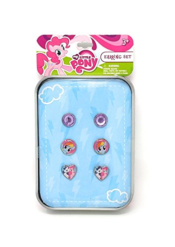 -. Feature : My Little Pony Earring Gift Set / Includes 3 pairs of earrings / One set of earrings features purple ''gems,'' one set features Rainbow Dash cameos, and the third set is heart-shaped and features Pinkie Pie and Rarity / Earrings come with a reusable tin (3'' x 4.5'' x 1'') / Tin lid features Rainbow Dash, Pinkie Pie, and Applejack