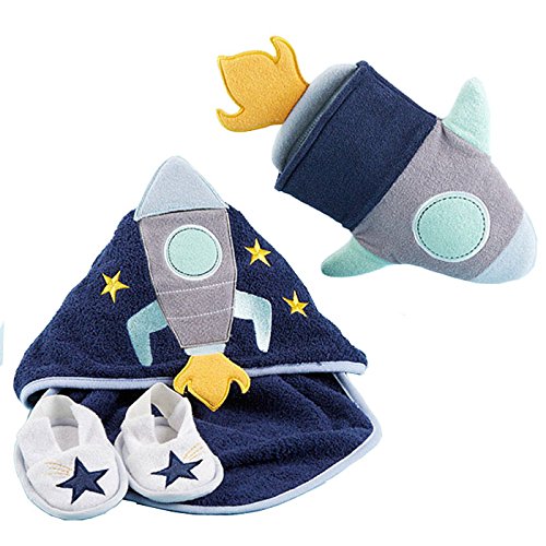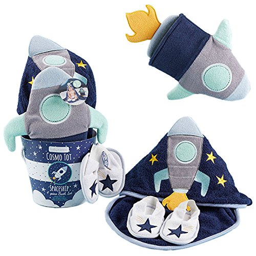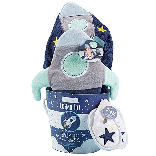 Studio : The Aspen Brands Publisher : The Aspen Brands Binding : Baby Product Product Description Welcome your little cosmo-tot into the world with a fun and functional gift that's sure to appeal to his sense of wonder. Baby Aspen's Cosmo Tot Spaceship 4-Piece Bath time Gift Set features a hooded towel, bath mitt and matching spa slippers, all adorned with extraterrestrial design elements. Features and facts:Space themed bath time gift set with hooded towel, bath mitt, and spa slippers for babyNavy blue hooded towel features a grey and blue rocket ship applique and yellow stars on the hood and light blue trimMatching bath mitt is shaped like a rocket ship in grey and blue with a 3-D yellow "flame" and mint detailingCoordinating bath slippers are white with light blue trim featuring a navy blue shooting star appliqueMachine washable, 100% cotton terry cloth towel and cotton-poly blend mitt and slippers.Size 0-9 monthsHooded towel measures 36" w x 40" h"Gift set measures 12.8" h x 5.9" in diameter 0