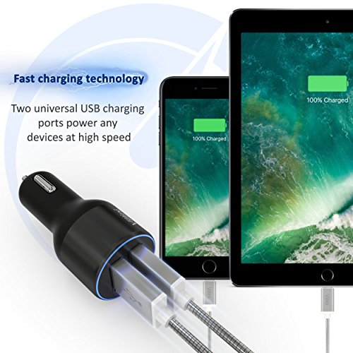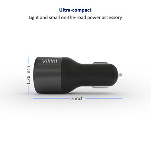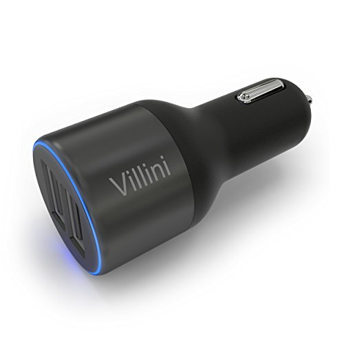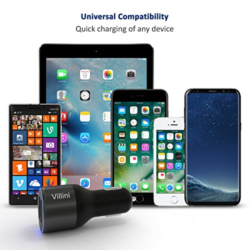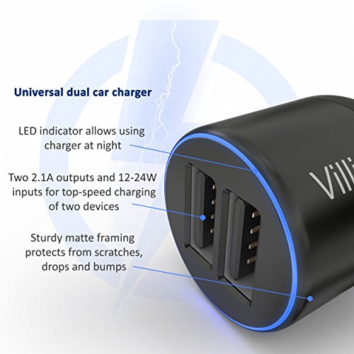 Villini USB Car Charging Adapter can power both iOS or Android devices at top speed! The charging speed depends on your device. 2 ports quickly and easily identify yours mobile devices, to provide optimal charging efficiency. Charging stops when battery is full. 5V 2.1A output for each port provides maximum charging speed for 2 devices. Villini Mini Car Charger Port powers devices quicker than the usual wall charger! 2.1A output means safe charging too. 12-24W input lets you use Best Charger in any car! Villini Car Charging Adapter is protected from overheating and overcurrent. Villini Cell Phone Rapid Car Charger charges smartphones and tablets including Apple iPhone 7 / 6s / 5 / SE / Plus, iPad Pro / mini / Air, Samsung Galaxy s8 / S7 / S6 / Edge / Plus , Note , BlackBerry , Asus , LG , Nexus , HTC , Lenovo , Xiaomi , and More . For even more efficient use choose the fast charging cable to maximize the charging speed. (Qualcomm Quick Charge 2.0/3.0 not supported.) Click 'ADD TO CART' to order your Villini Car USB Charger NOW! 0