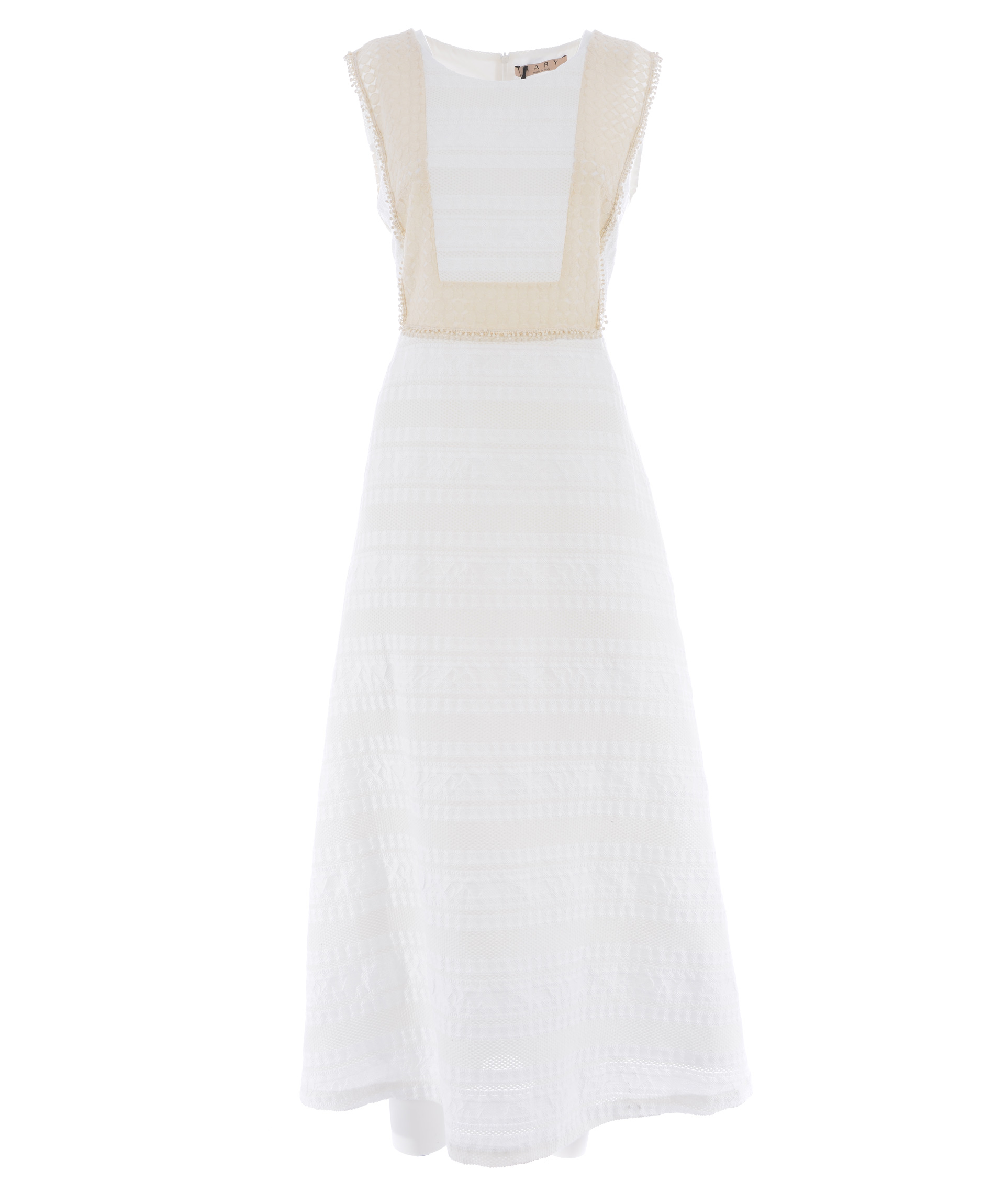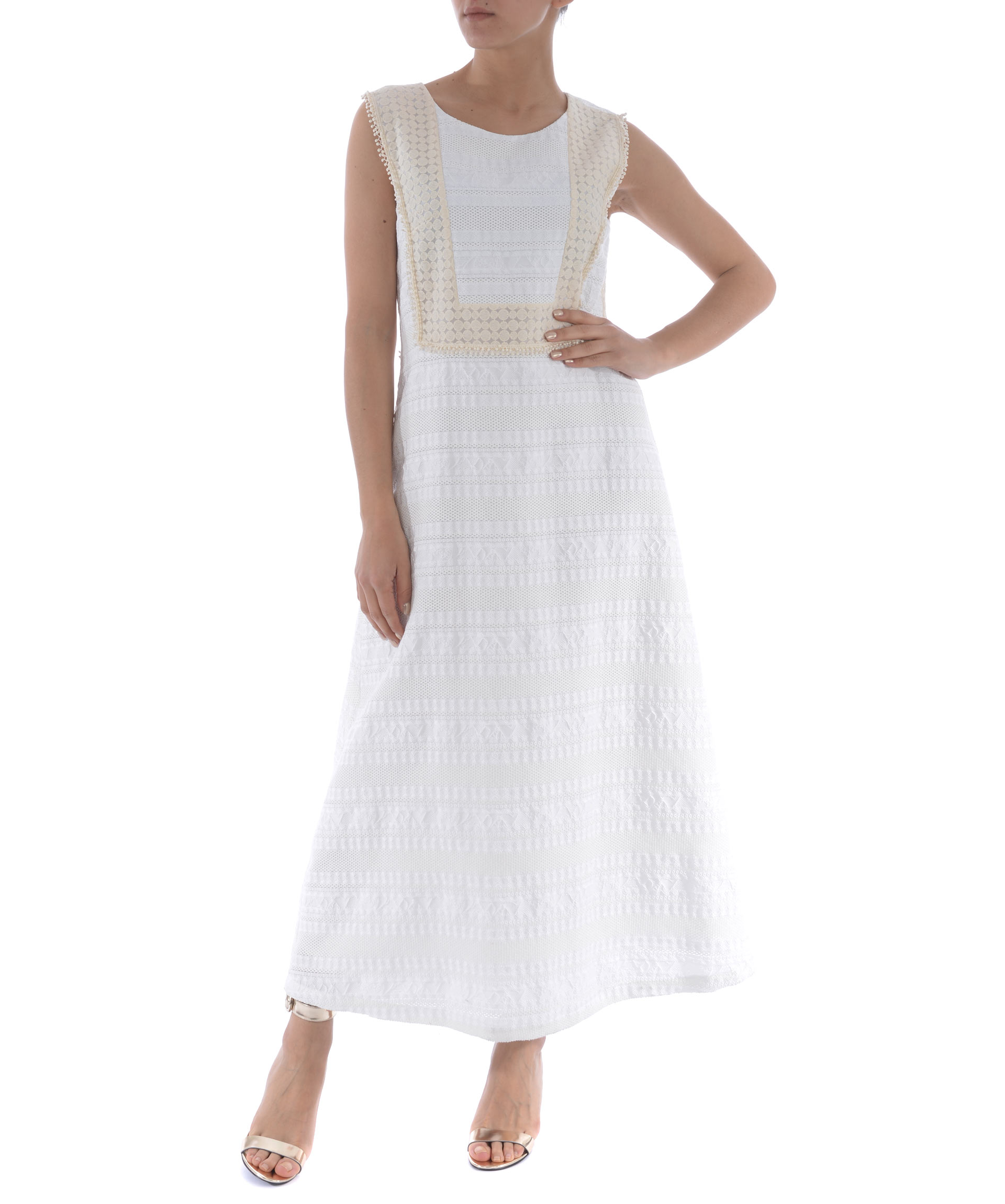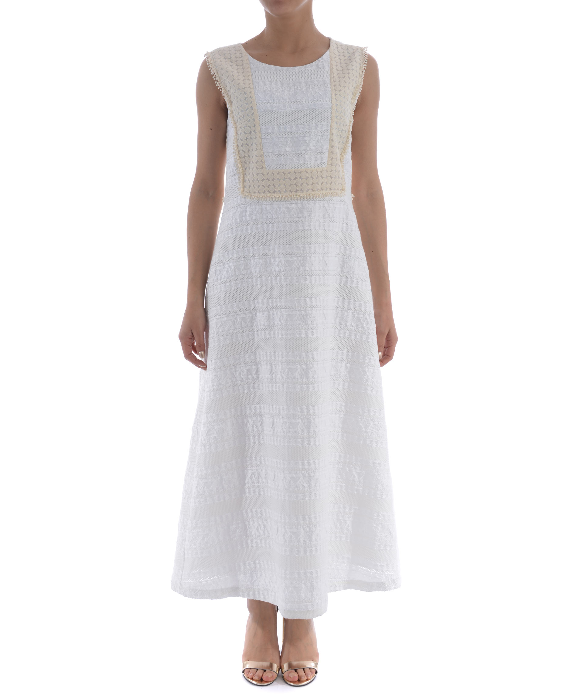 Abito lungo Rary in pizzo Bianco. Inserto frontale in pizzo Beige. Girocollo. Smanicato. Svasato al fondo. Chiusura sul retro con zip a scomparsa. Foderato.