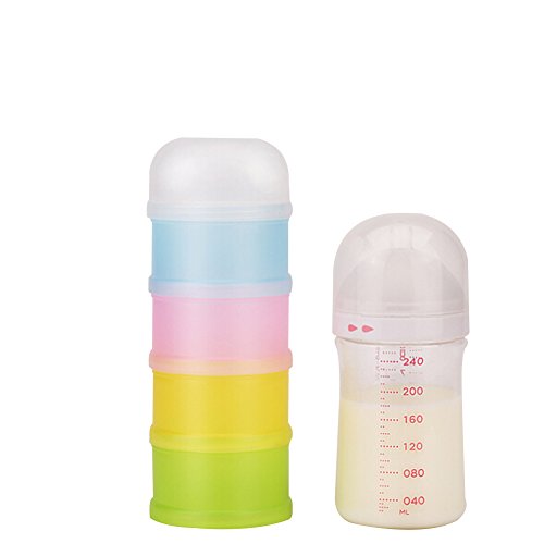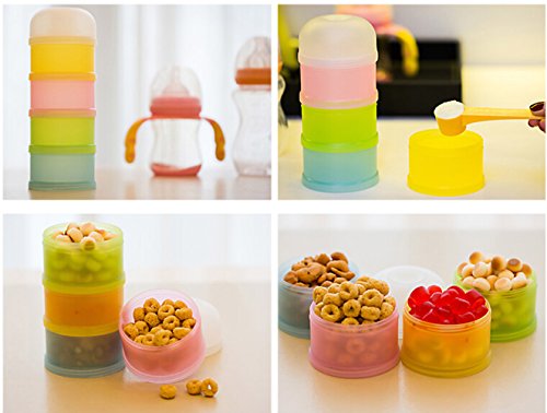 Four stackable containers set, full 9 ounces of powdered formula or 2.3oz of dry goods fit in each compartment. Compact size fits easily in diaper bags, luggage or purses.