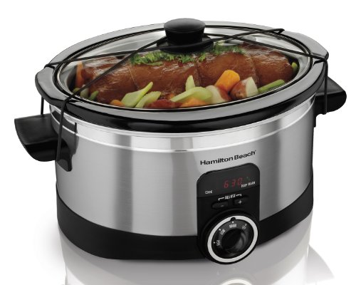 33565 Features: -Spill resistant travel. -Perfect size for 6 lbs chicken or 4 lbs roast. -Simple programmability. -Automatically switches to warm when time is up. -Cook and warm indicator lights. -Lid latch strap anchors lid securely for easy travel. Product Type: -Slow cooker. Shape: -Oval. Finish: -Silver/black. Number of Items Included: -3. Portable: -Yes. Removable Interior: -Yes. Warming Setting: -Yes. Operation Type: -Programmable. Dishwasher Safe: -Yes. Capacity: -6 Quarts. Dimensions: Overall Height - Top to Bottom: -10.4". Overall Width - Side to Side: -16.1". Overall Depth - Front to Back: -12".Feature
