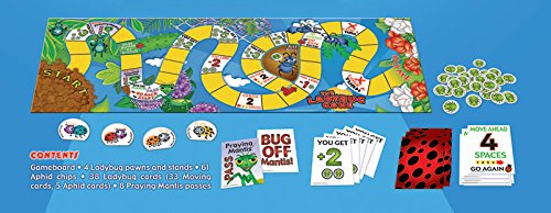 Kids will fall in love with the characters and memorize the story of the Ladybug Adventure as they learn to count and read. The Ladybug Game uses a clever combination of colors, numbers, words and symbols to help even the youngest kids catch on quickly. Soon they will be playing on their own, again and again, as they encounter all the adventures, challenges and characters in the garden, including the Praying Mantis, the Aphids, and the three Lazy Ants. The Ladybug Game is positively adorable with its beautiful artwork. Kids will even learn a little about the bugs in their garden.Feature