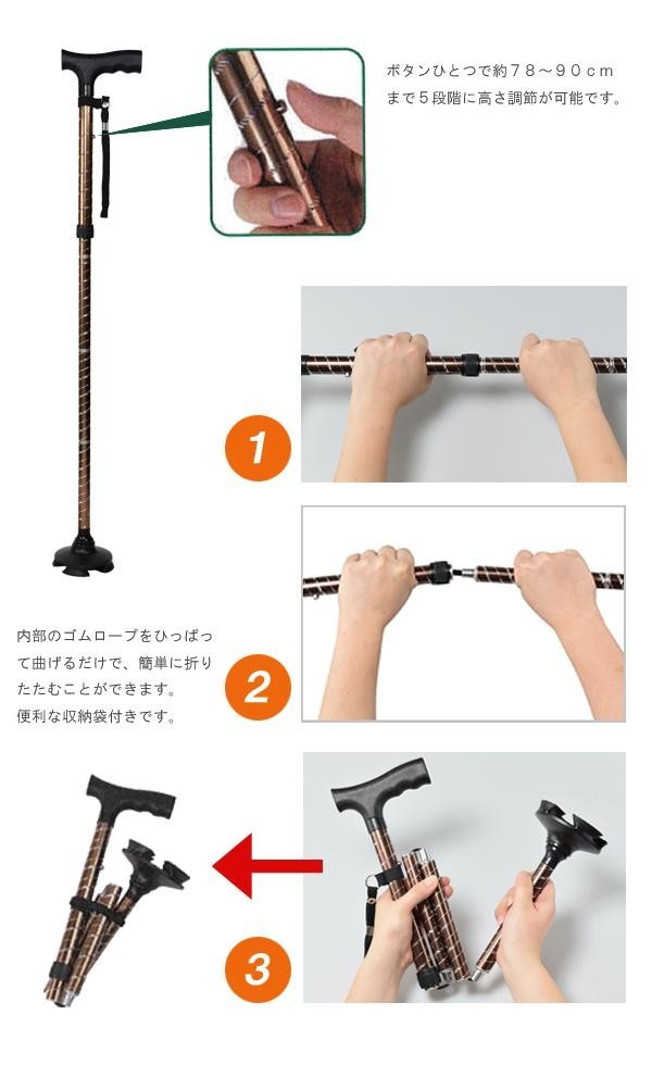 ボタンひとつで5段階に長さが変更できます。内部のゴムロープでひっぱって曲げるだけで、簡単に折りたためます。足部分が大きいので手を離しても倒れにくい。外出時やお買い物の時にとても便利です。さらに回転軸設計で、坂道・芝生・砂利道でも杖の先が地面にあわせて動くので、安定した歩行が可能です。 |