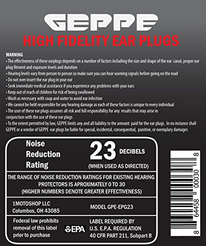 -. Binding : Misc. -. Brand : GEPPE -. EAN : 0864458000308 -. Feature : PROTECT YOUR HEARING with High Fidelity noise cancelling ear plugs. Precisely filter out wind and attenuate unwanted noise while reproducing what you want to hear with little distortion or muffling. / IDEAL CHOICE for motorcyclists, loud environment workers and concert goers. / REUSABLE & COMFORTABLE made in soft hypoallergenic silicone, durable and water resistant washable with just soap and water. The attenuation filter valve allows ventilation to reach the auditory duct. / PORTABLE with the included aluminum keychain to take your earplugs everywhere you go. The ear plugs can be worn with or without the included cord. / UNIVERSAL fit for most medium size ear canals. -. Label : GEPPE -. Manufacturer : GEPPE -. Model : GPE-EPG23 -. MPN : GPE-EPG23 -. PartNumber : GPE-EPG23 -. ProductGroup : Home Improvement -. ProductTypeName : TOOLS -. Publisher : GEPPE -. Studio : GEPPE -. Title : Ear Plugs High Fidelity Noise Cancelling Washable & Reusable NRR 23dB. Motorcycle, Loud Machinery & Concerts. GEPPE -. UPC : 864458000308