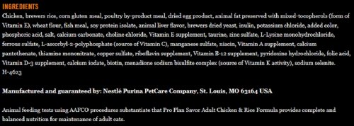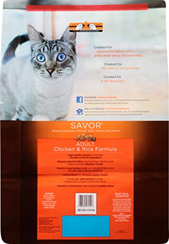 - Feature : One (1) 16-Pound bag of Purina Pro Plan Savor Adult Chicken and Rice Formula / High-quality protein, including chicken as the #1 ingredient. / Made with 40% protein to help meet a cat's unique nutritional needs / Omega fatty acids for skin and coat nourishment / Natural prebiotic fiber helps promote digestive health / Antioxidants for immune system health / Vitamin A and taurine help support healthy vision